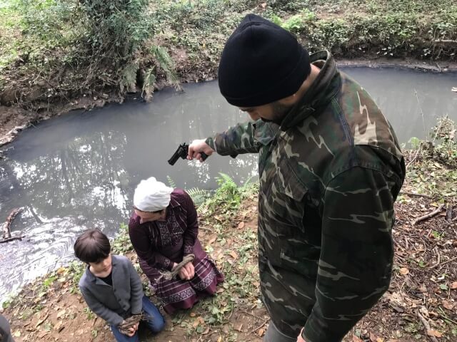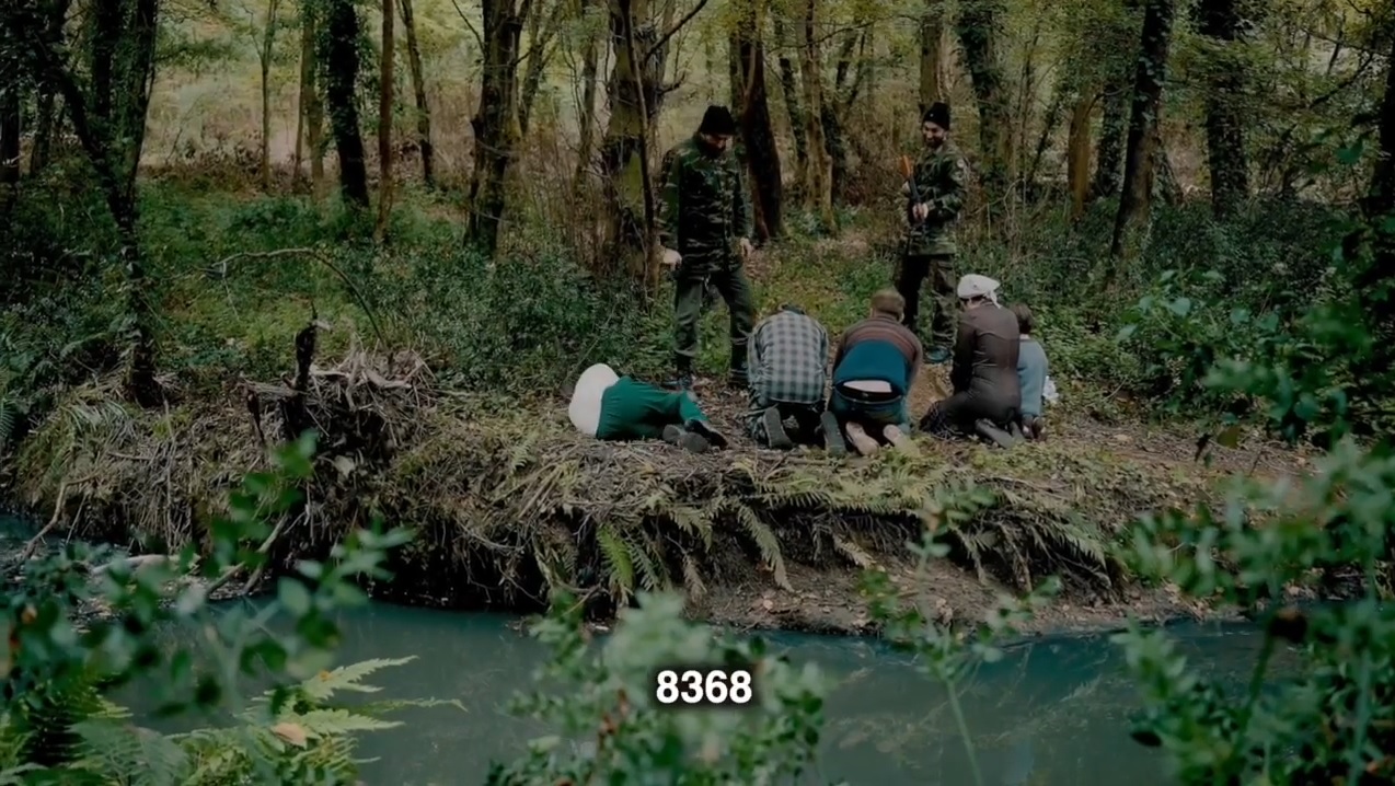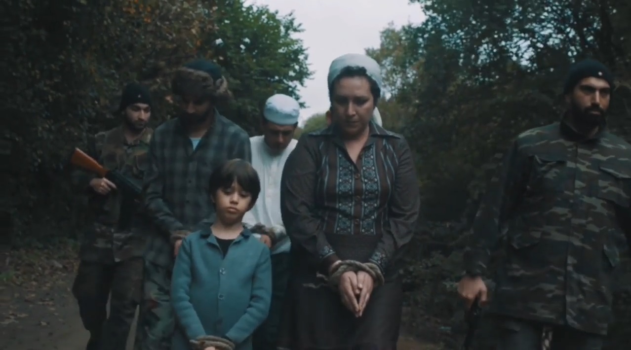 Paylaşılan görselde diz çökmüş vaziyetteyken kafalarına silah doğrultulan anne ve çocuğu kısa filmde elleri bağlı şekilde ormanda yürürken net şekilde görebiliyoruz.