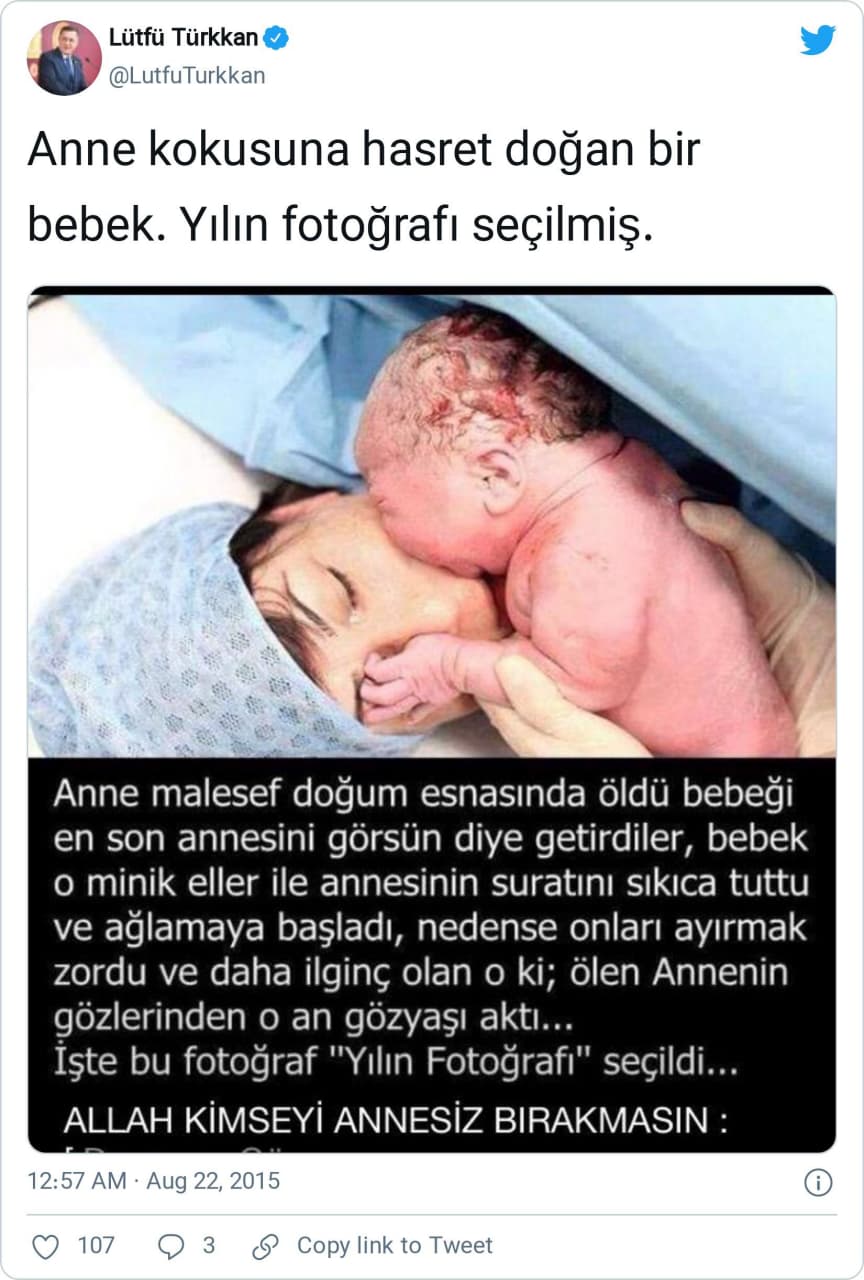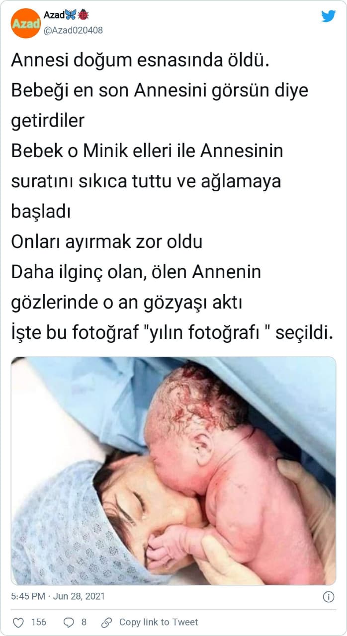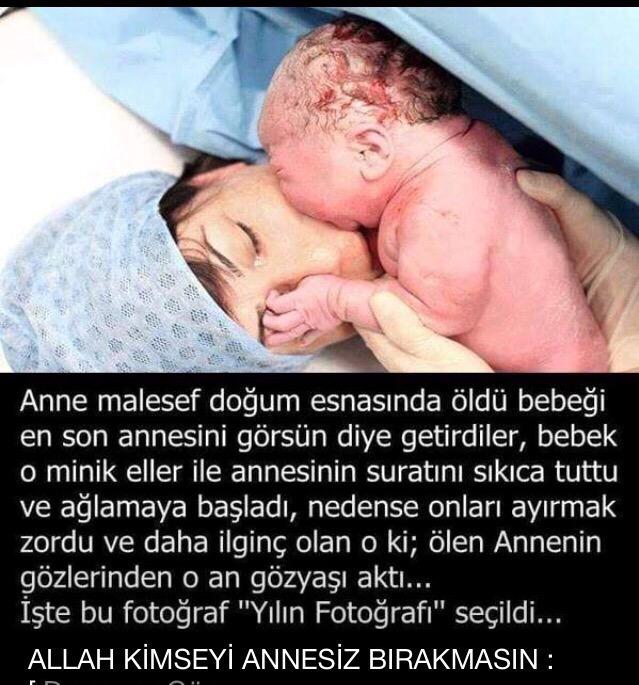 “Annesi doğum esnasında öldü. Bebeği en son Annesini görsün diye getirdiler Bebek o Minik elleri ile Annesinin suratını sıkıca tuttu ve ağlamaya başladı Onları ayırmak zor oldu Daha ilginç olan, ölen Annenin gözlerinde o an gözyaşı aktı İşte bu fotoğraf “yılın fotoğrafı ” seçildi. Allah kimseyi annesiz bırakmasın”