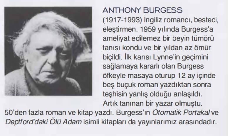 ANTHONY BURGESS (1917-1993) İngiliz romancı , besteci, eleştirmen . 1 959 yılında Burgess’a ameliyat edilemez bir beyin tümörü tanısı kondu ve bir yıldan az ömür biçildi. İlk karısı Lynne’in geçimini sağlamaya kararlı olan Burgess öfkeyle masaya oturup 1 2 ay içinde beş buçuk roman yazdıktan sonra teşhisin yanlış olduğu anlaşıldı. Artık tanınan bir yazar olmuştu. 50’den fazla roman ve kitap yazdı .