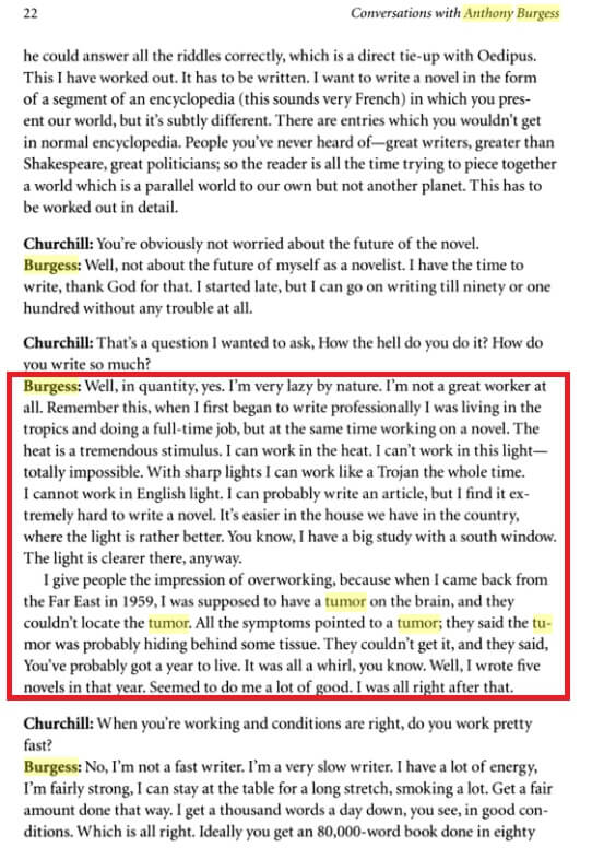 Verdiği bir demeçte doktorların beyninde tümörün olup olmadığını tam olarak tespit edemediğini, kendisine 1 yıl ömrünün kaldığının söylendiğini, bu 1 yıllık sürede 5 kitap yazdığını söylemiş (Conversations with Anthony Burgess. 2008. University Press Of Missisippi. Ed: Earl G. Inersoll & Mary C. Ingersoll) (“You’ve had your time : the second part of the confessions” adlı otobiyografik eserde de bu duruma değinmiş).