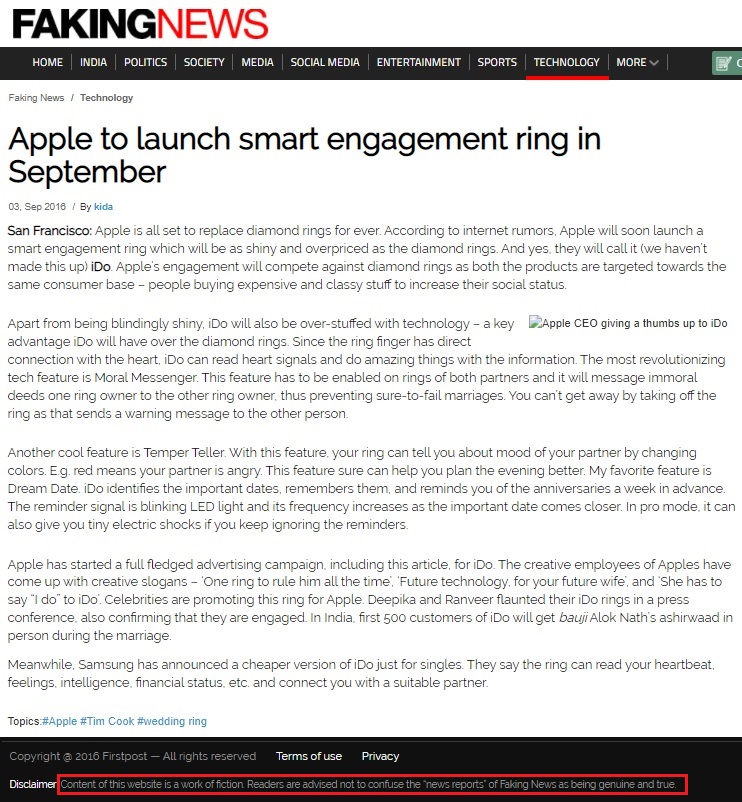 Apple’ın akıllı alyans geliştirdiği iddiasının kökeninin, fakingnews.firstpost.com adresli internet sitesinde 2016 yılında yayımlanan Apple’ın akıllı evlilik / nişan alyansı üretmeyi tasarladığı yönündeki parodi metne dayandığı anlaşılıyor. Söz konusu internet sitesinin “Bu internet sitesinin içeriği kurgu işidir” (“Content of this website is a work of fiction”) ibaresini taşıdığı görülüyor. Söz konusu parodi metinde Apple’ın satışa sunacağı iDo adlı alyansın eşlerin / partnerlerin ahlaksız davranışları hakkında uyarı vereceği, renk değiştirerek ruh hâllerini göstereceği, önemli tarihleri ve yıl dönümlerini hatırlatacağı kurgulanmıştı.