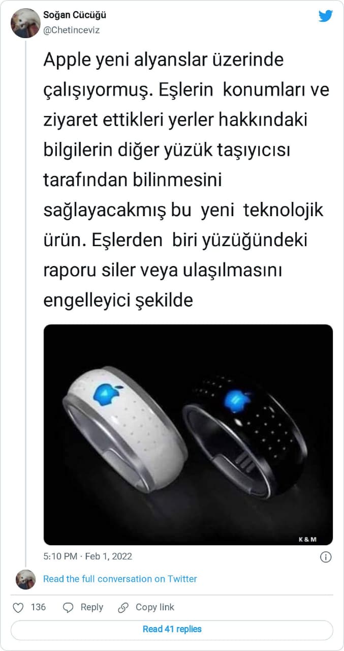 “Bu da oldu! AKILLI ALYANS! Eşler birbirini takip edebilecek, girip çıktığı gittiği yerleri raporlayacak; eşlerden biri yüzüğünü kapatır ya da parmağına takmaz ise diğerine uyarı gidecek… Hayırlı olsun! #Apple #marriage #evlilikhakkındaherşey #düğün #koca #evli”