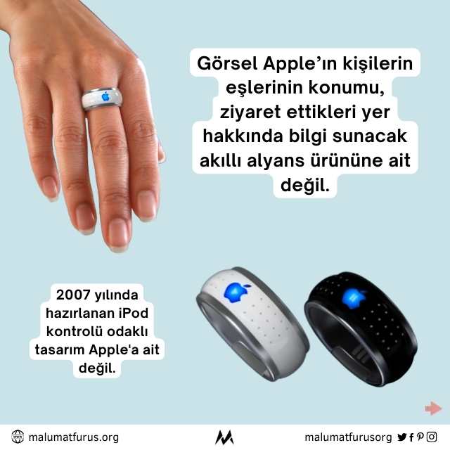 Yani, paylaşılan akıllı yüzük ürün görselleri Apple’ın resmî tasarımı değil (Apple’ın erken dönem mavi renkli elma logosunun kullanılmış olması da dikkat çekiyor). Ayrıca, görseldeki ürün tasarımının iPod erişimi odaklı olduğu, evlilik / nişan alyansı olmadığını da vurgulamakta fayda var.