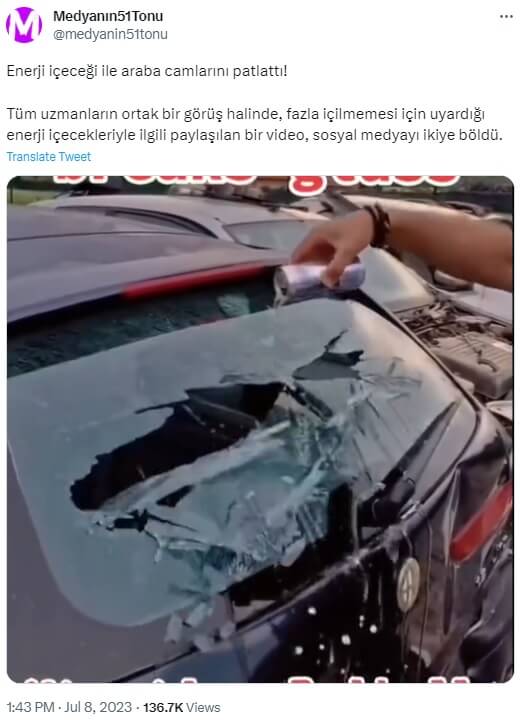 Medyanın51Tonu: “Enerji içeceği ile araba camlarını patlattı! Tüm uzmanların ortak bir görüş halinde, fazla içilmemesi için uyardığı enerji içecekleriyle ilgili paylaşılan bir video, sosyal medyayı ikiye böldü.”
