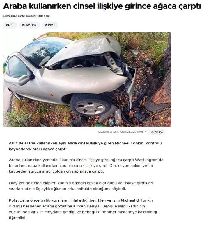 Vaşington‘da bir erkek otomobil kullanırken yanındaki kadınla cinsel ilişkiye girerken direksiyon hakimiyetini kaybedip yoldan çıkan aracıyla ağaca çarpmış.