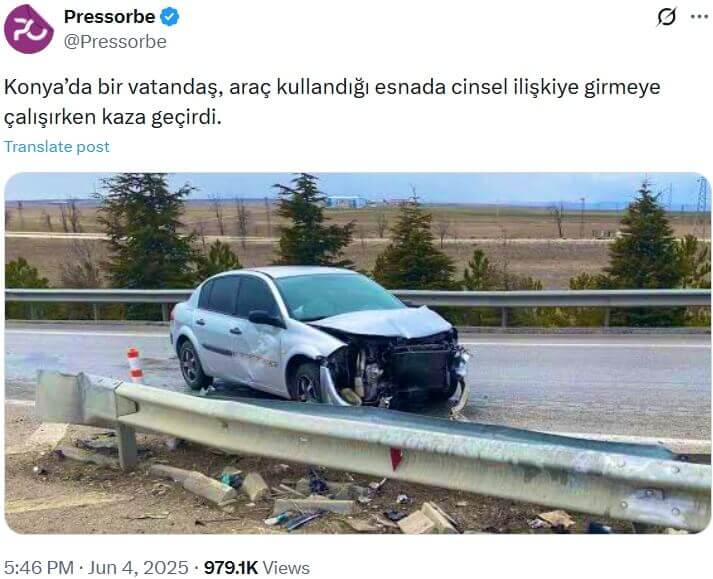 News Turkic (@newsturkic): “Konya’da bir vatandaş, araç kullandığı esnada cinsel ilişkiye girmeye çalışırken kaza geçirdi.”