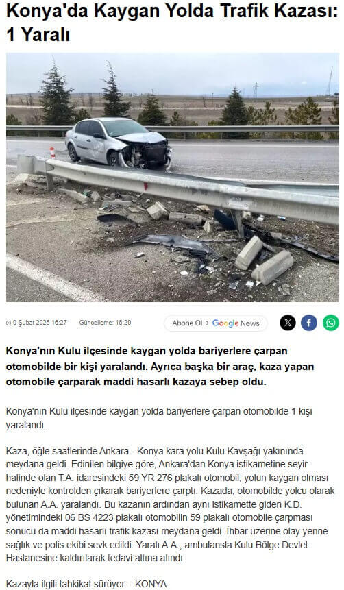 Konya’da bir vatandaşın araç kullanırken cinsel ilişkiye girdiği için kaza yaptığı iddiası uydurularak ilintisiz fotoğraflarla paylaşılmış