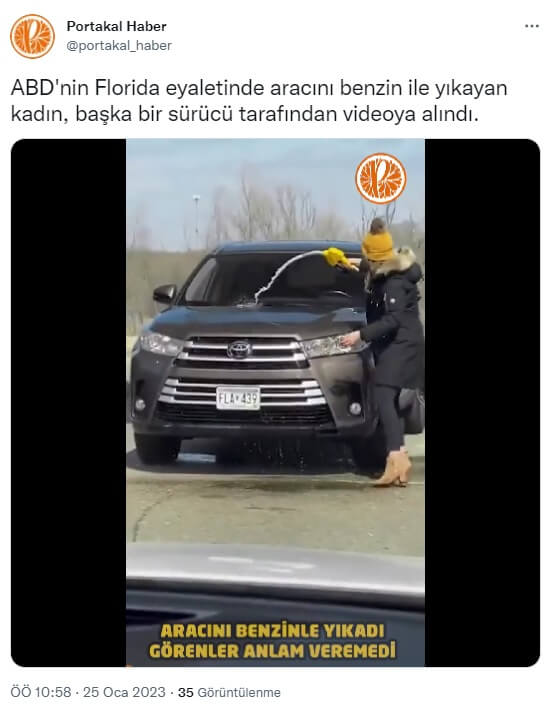 Portakal Haber (@portakal_haber): “ABD’nin Florida eyaletinde aracını benzin ile yıkayan kadın, başka bir sürücü tarafından videoya alındı.”