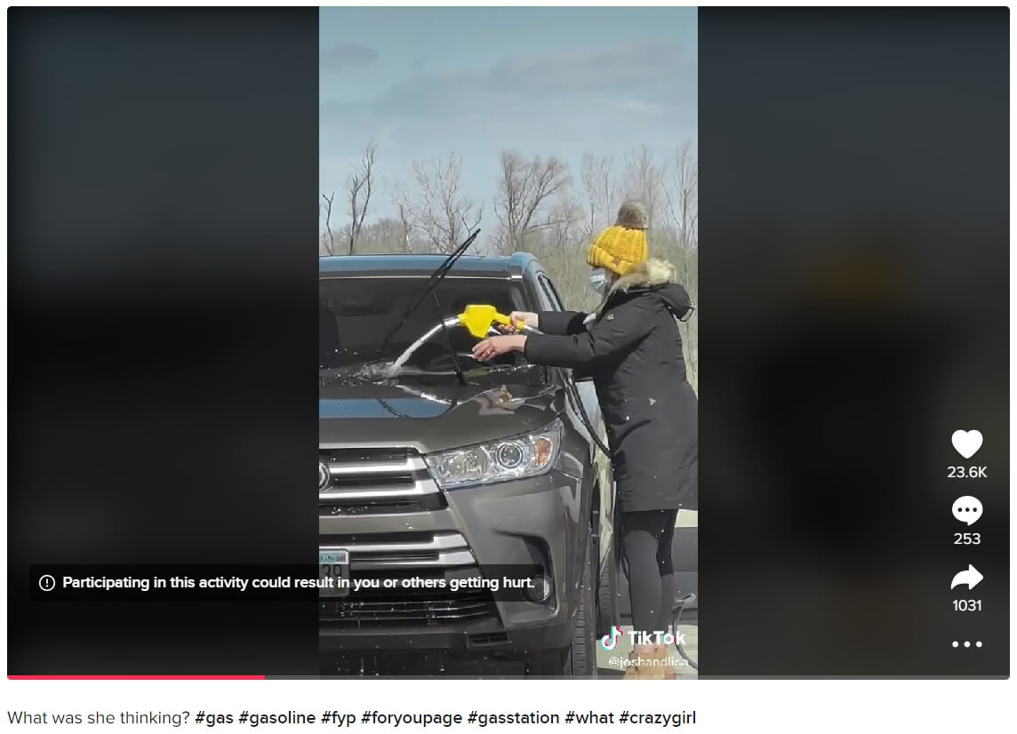 Söz konusu profil arabanın benzinle yıkandığı sanılan videoyu 3 Nisan 2021 günü “Ne düşünüyordu ki? #benzin #yakıt #benzinistasyonu #ne #çılgınkız” (“What was she thinking? #gas #gasoline #fyp #foryoupage #gasstation #what #crazygirl”) etiketleriyle paylaşmış.