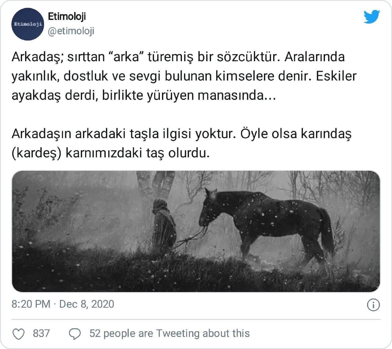Arkadaş kelimesinin kökeninin “arka taş” ifadesine dayandığını öne süren paylaşım