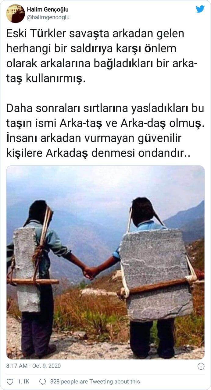 Atalarımız bozkır hayatı yașarken arkadan herhangi bir saldırıya mani olmak için sırtlarını bir ağaca, kayaya veya taşa vererek ok atarlardı. “Sırt dayanan taş“a “Arka-taş” demişler, oradan da “Arkadaş” olarak dilimize yerleşmiştir. Arkadaş, yani sırtını dayayabileceğin kişi…”