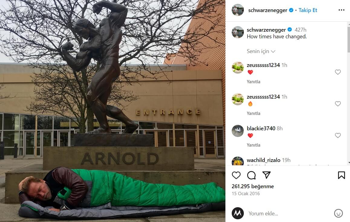“ABD’li Ünlü Aktör ARNOLD SCHWARZENEGGER, Sosyal Medya hesaplarından, meşhur Bronz Heykelinin önünde uyurken çekilmiş bir Fotoğrafını paylaştı ve Fotoğrafın altına “Zaman nasıl da değiştiriyor”… diye not düştü. Fakat Arnold’un bunu yazmasının tek sebebi, gerçekten de yaşlanmış olması değildi. Kendisi Kaliforniya Valisiyken, bu Heykelin bulunduğu yerde bir Otelin açılışını yapmıştı. Otel yetkilileri açılıştan sonra Arnold’a :