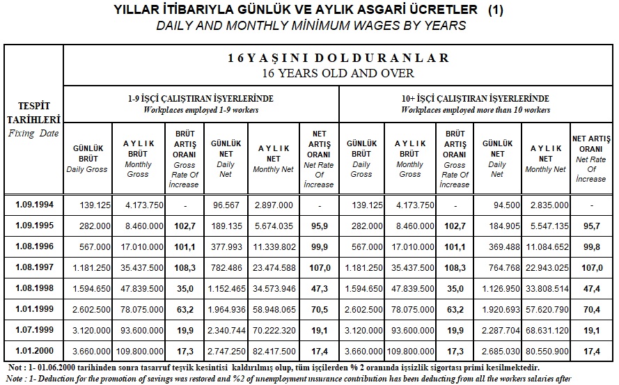 Bakanlık internet sitesinde paylaşılan Çalışma Hayatı İstatistikleri – 2000 adlı yayına ait tablolarda da geçmişte % 50’den yüksek oranda asgari ücret zammı yapıldığını görmek mümkün.