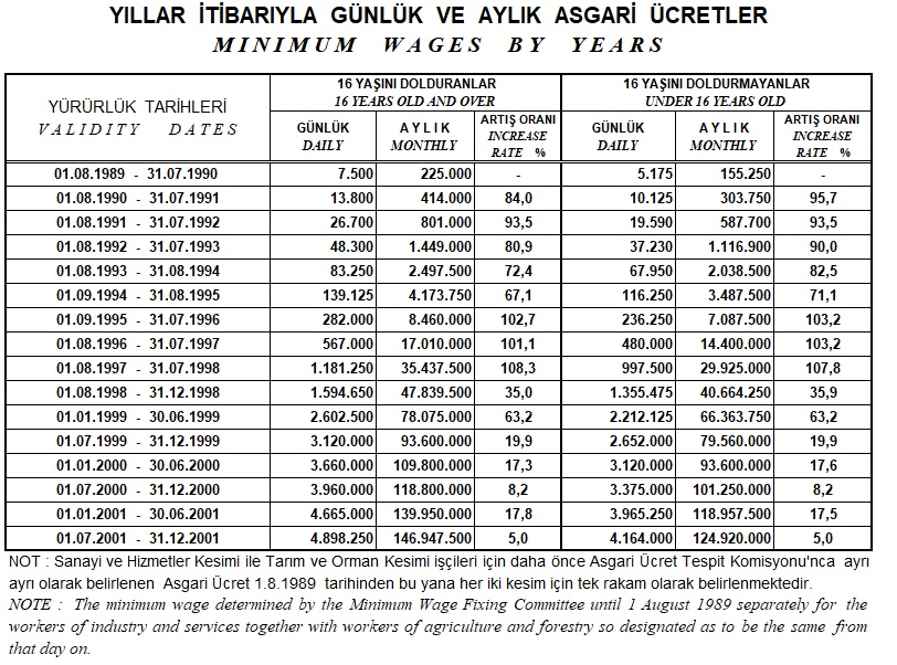 1974 yılında bu yana ulusal düzeyde hesaplanan 16 yaşını dolduran ve bekarlar İçin yıllara göre günlük ve aylık asgari ücretlerde yapılan artışlar incelendiğinde % 50’den yüksek zamların yapıldığı anlaşılıyor. Özellikle, hiperenflasyonist olarak nitelenebilecek 1990’lı yıllar boyunca asgari ücrete % 50’den fazla zam yapıldığı dönemler olmuştu.