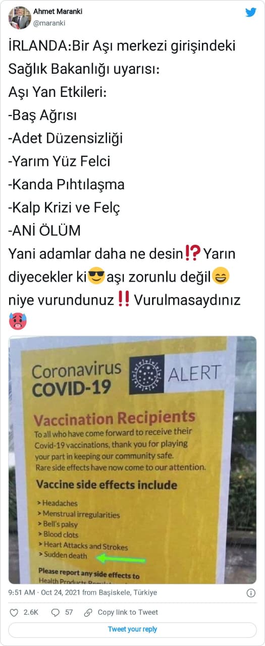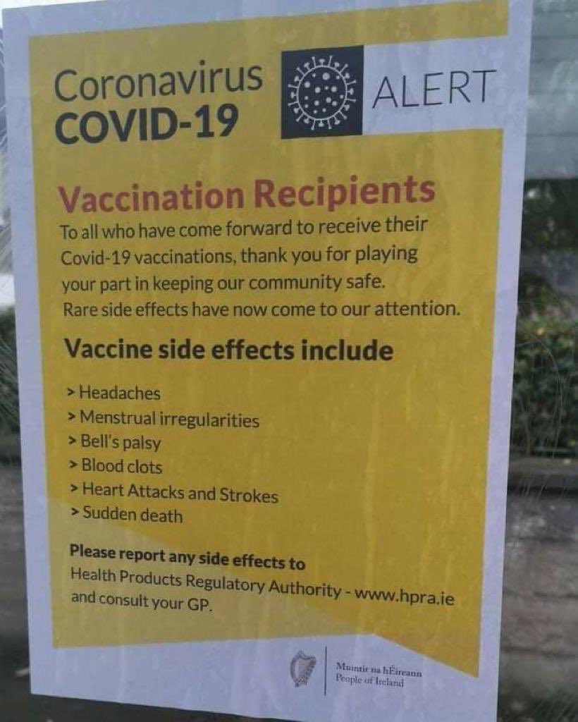 “İRLANDA: Bir Aşı merkezi girişindeki Sağlık Bakanlığı uyarısı: Aşı Yan Etkileri: -Baş Ağrısı -Adet Düzensizliği -Yarım Yüz Felci -Kanda Pıhtılaşma -Kalp Krizi ve Felç -ANİ ÖLÜM Yani adamlar daha ne desin Yarın diyecekler ki aşı zorunlu değil niye vurundunuz Vurulmasaydınız”