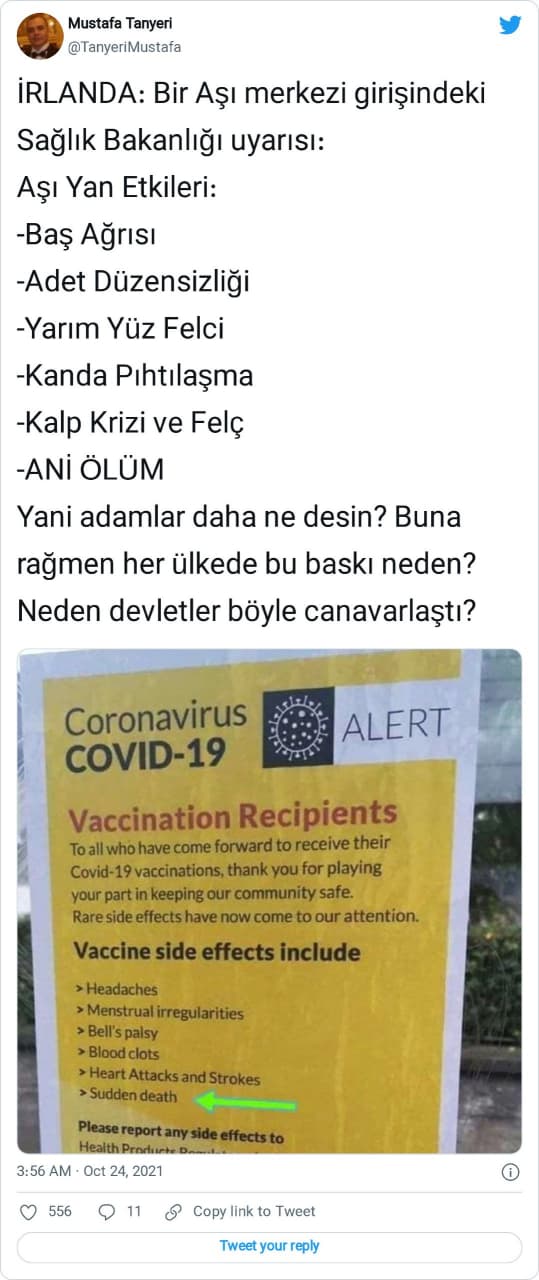 “İRLANDA: Bir Aşı merkezi girişindeki Sağlık Bakanlığı uyarısı: Aşı Yan Etkileri: -Baş Ağrısı -Adet Düzensizliği -Yarım Yüz Felci -Kanda Pıhtılaşma -Kalp Krizi ve Felç -ANİ ÖLÜM Yani adamlar daha ne desin? Buna rağmen her ülkede bu baskı neden? Neden devletler böyle canavarlaştı?”