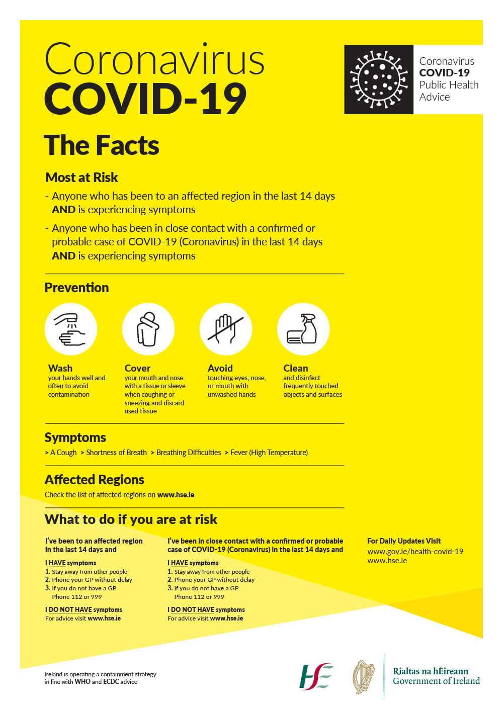 İrlanda’da kamuoyuyla paylaşılan koronavirüs salgınıyle ilgili duyurularda “Rialtas na hÉireann”, “Government of Ireland”, yani İrlanda Hükümeti ile Sağlık Hizmetleri Birimi ( Health Service Executive – HSE) logosunun yer aldığı görülebiliyor.