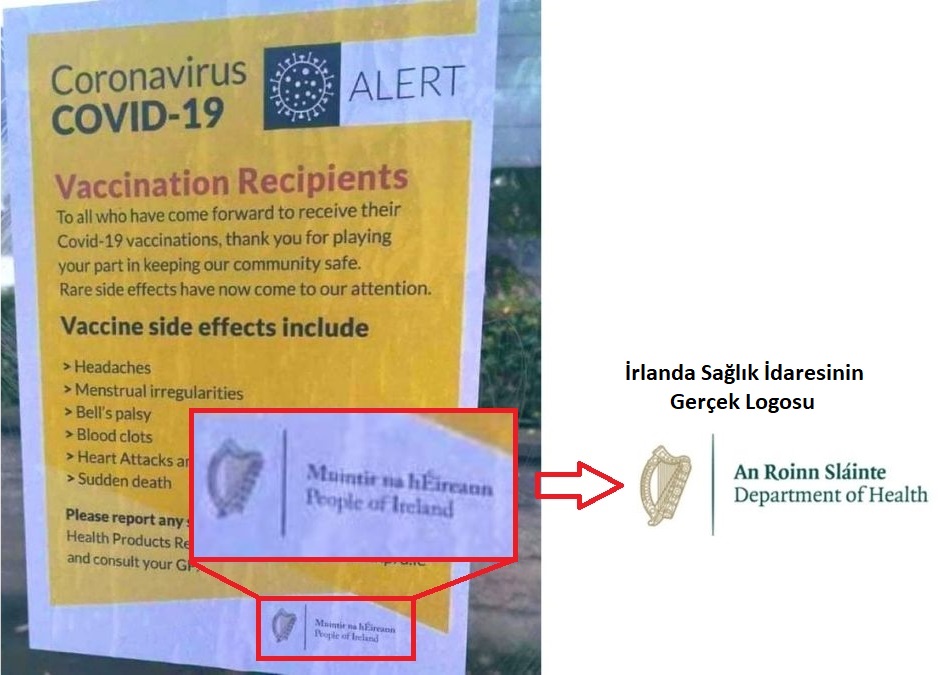 Sahte görselin sağ alt köşesinde “Muintir na hÉireann” ve “People of Ireland” yazılarının ve İrlanda Sağlık Ürünleri Düzenleme Kurumu (Health Products Regulatory Authority – HPRA) logosunun yer aldığı görülebiliyor (Muintir na hÉireann, 1994-1996 yılları arasında İrlanda’da faaliyette bulunan muhafazakâr ve popülist tercihleriyle tanınan bir siyasî partidir). İrlanda’da sağlık alanında düzenleyici idarenin logosunda “An Roinn Sláinte” ve “Department of Health” ibareleri bulunmaktadır (An Roinn Sláinte, İrlanda dilinde Sağlık Birimi anlamına gelmektedir).