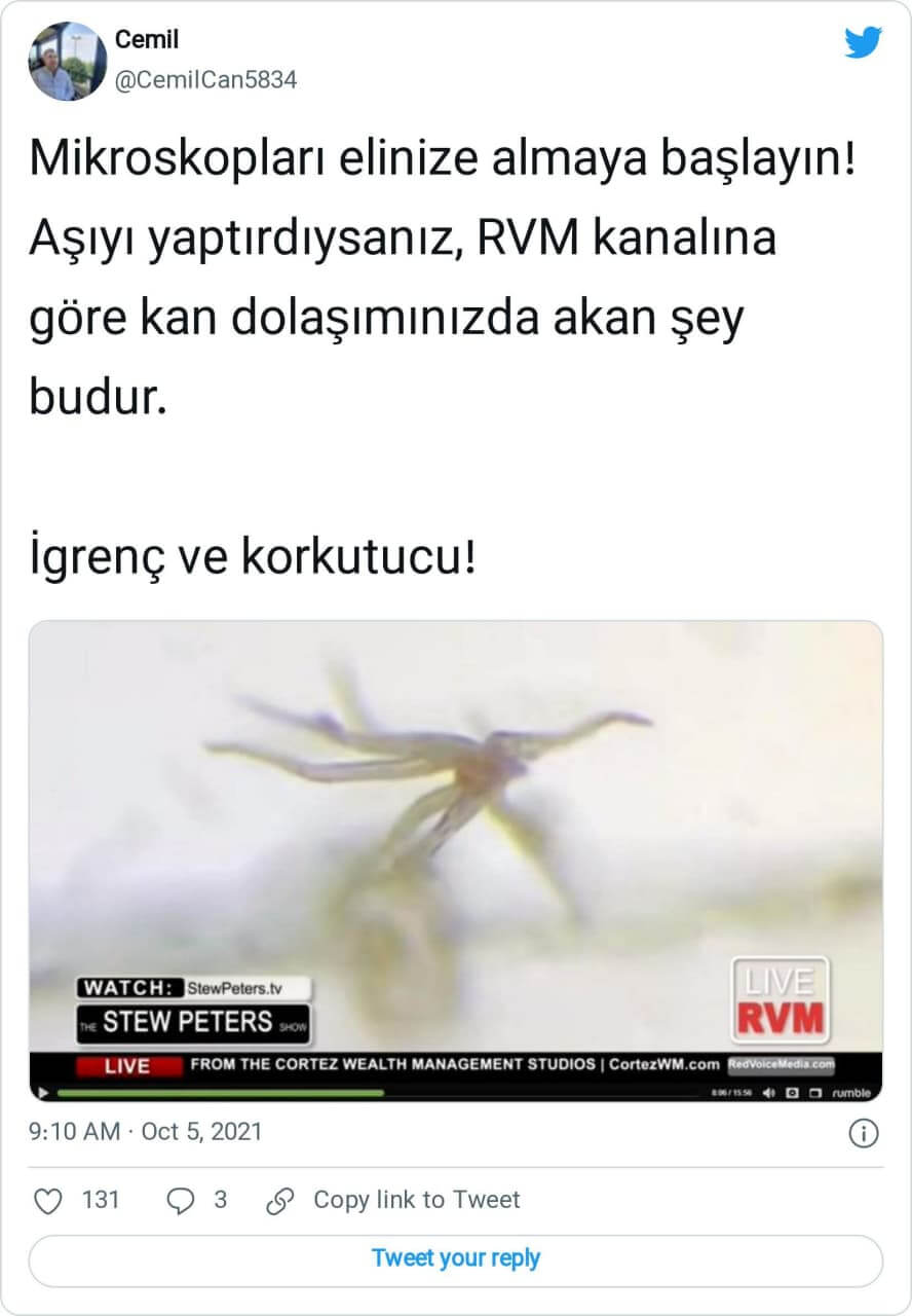 “Mikroskopları elinize almaya başlayın! Aşıyı yaptırdıysanız, RVM kanalına göre kan dolaşımınızda akan şey budur. İgrenç ve korkutucu!”