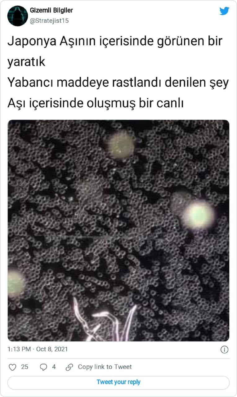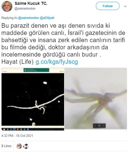 “Bu parazit denen ve aşı denen sıvıda ki maddede görülen canlı, İsrail’i gazetecinin de bahsettiği ve insana zerk edilen canlının tarifi bu filmde dediği, doktor arkadaşının da incelemesinde gördüğü canlı budur .”