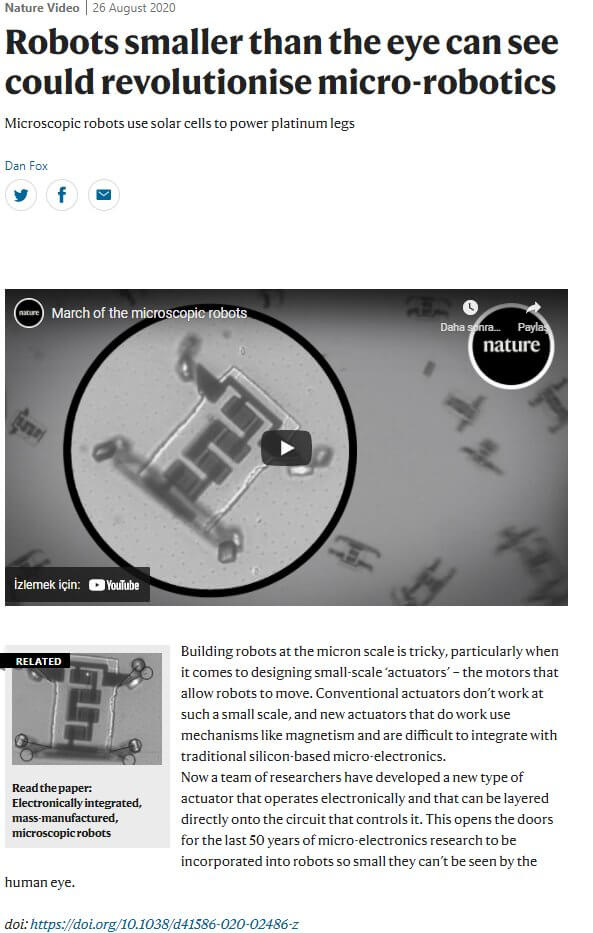 Paylaşılan mikro robot görselinin kaynağı, Pennsylvania Üniversitesi’nden Yrd. Doç. Dr. Marc Miskin, Prof. Itai Cohen, Paul McEuen ve Alejandro Cortese gibi isimlerin katkı sunduğu Nature’de yayımlanan “Electronically integrated, mass-manufactured, microscopic robots” başlıklı makale.