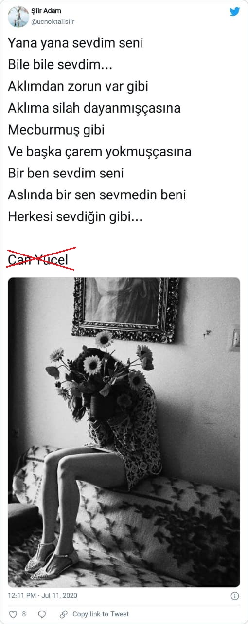 Şiirin, muhtelif sosyal medya platformlarında Can Yücel imzasıyla yer aldığını görüyoruz: