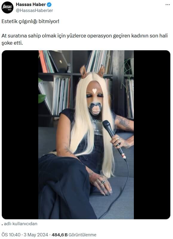Hassas Haber (@HassasHaberler): “Estetik çılgınlığı bitmiyor! At suratına sahip olmak için yüzlerce operasyon geçiren kadının son hali şoke etti.”