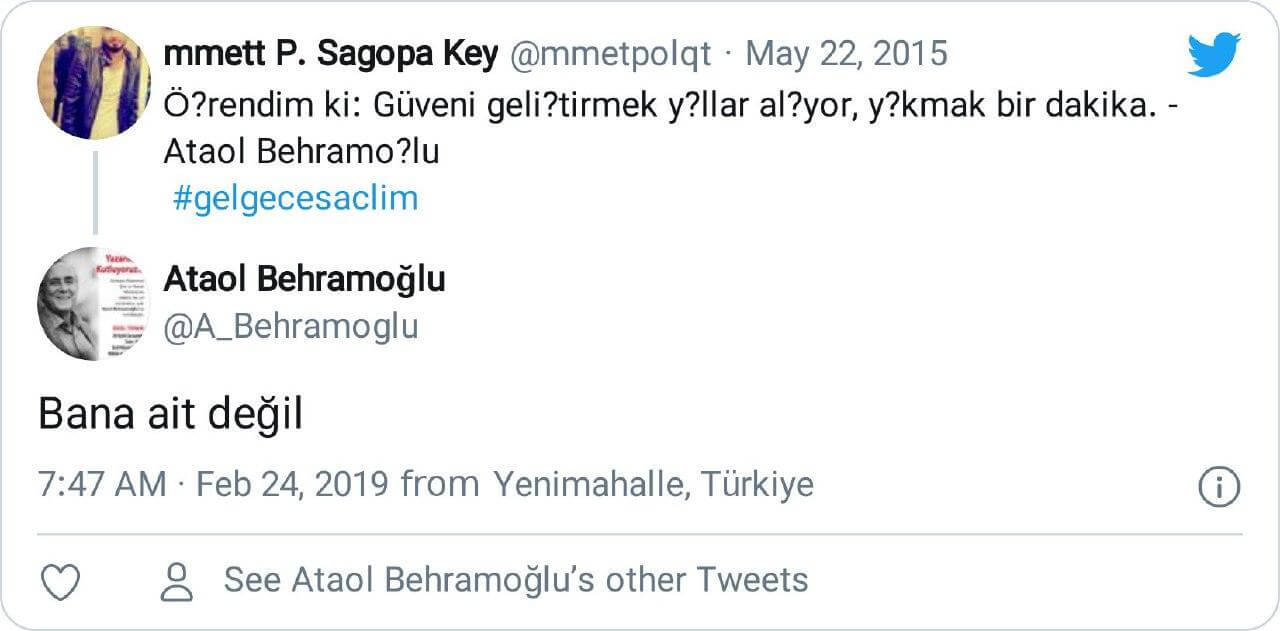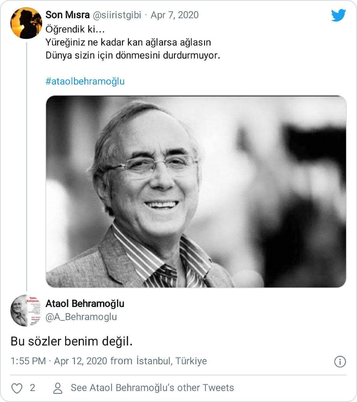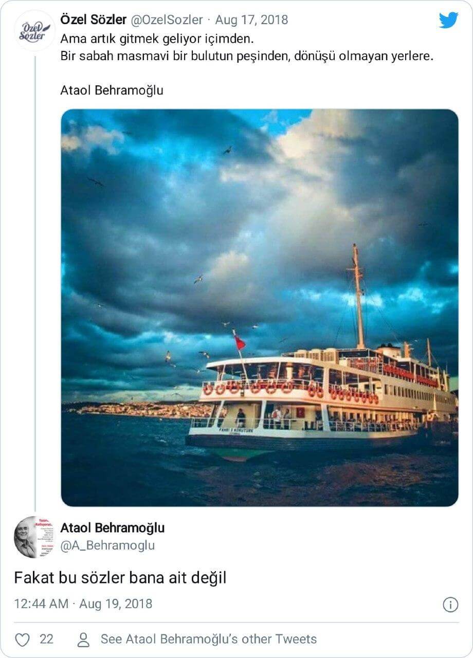 Bir tekzip de bizden Cumhuriyet gazetesi yazarı Ataol Behramoğlu’na gelsin… Twitter üzerinde “Ama artık gitmek geliyor içimden. Bir sabah masmavi bir bulutun peşinden, dönüşü olmayan yerlere.” sözünün kendisine ait olmadığını belirtmiş. Ancak bu ifadeler, “Melankoli” adlı şiirinin son 4 dizesinden: