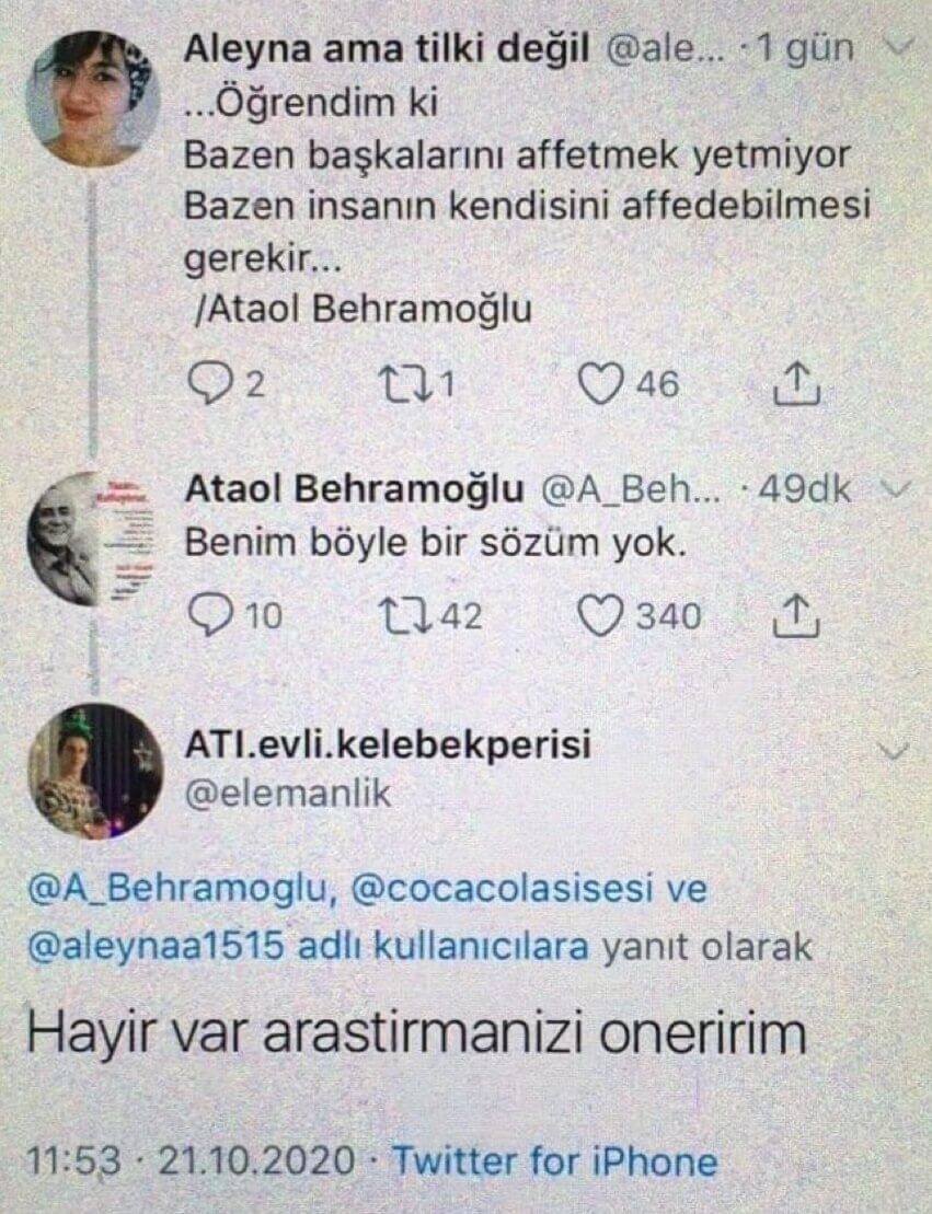 Ataol Behramoğlu “Öğrendim ki… Bazen başkalarını affetmek yetmiyor. Bazen insanın kendisini affedebilmesi gerekir..” sözünün kendisine ait olmadığını beyan ederken bir sosyal medya kullanıcısından “hayır var araştırmanızı öneririm” yanıtını almıştı.
