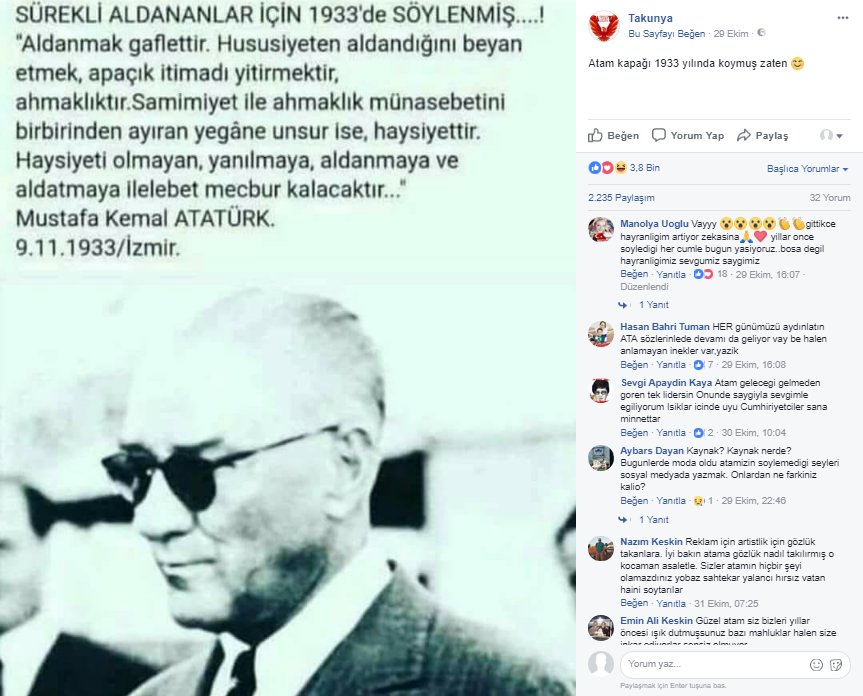 Bahse konu sözün sahipliğini Atatürk’e izafe eden sosyal medya paylaşımı ve görsel örneği şu şekilde: