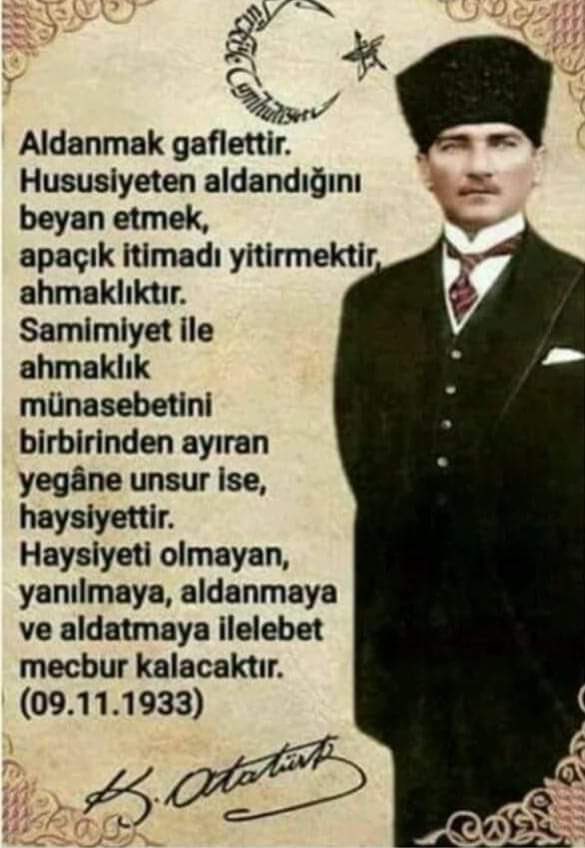 “Aldanmak Gaflettir. Hususiyeten Aldandığını Beyan Etmek, Apaçık İtimadı Yitirmektir, Ahmaklıktır. Samimiyet İle Ahmaklık Münasebetini Birbirinden Ayıran Yegâne Unsur İse Haysiyettir. Haysiyeti Olmayan, Yanılmaya, Aldanmaya Ve Aldatmaya İlelebet Mecbur Kalacaktır.” Sözünün Mustafa Kemal Atatürk’e Ait Olduğuna Dair Bir Delile Rastlanamıyor