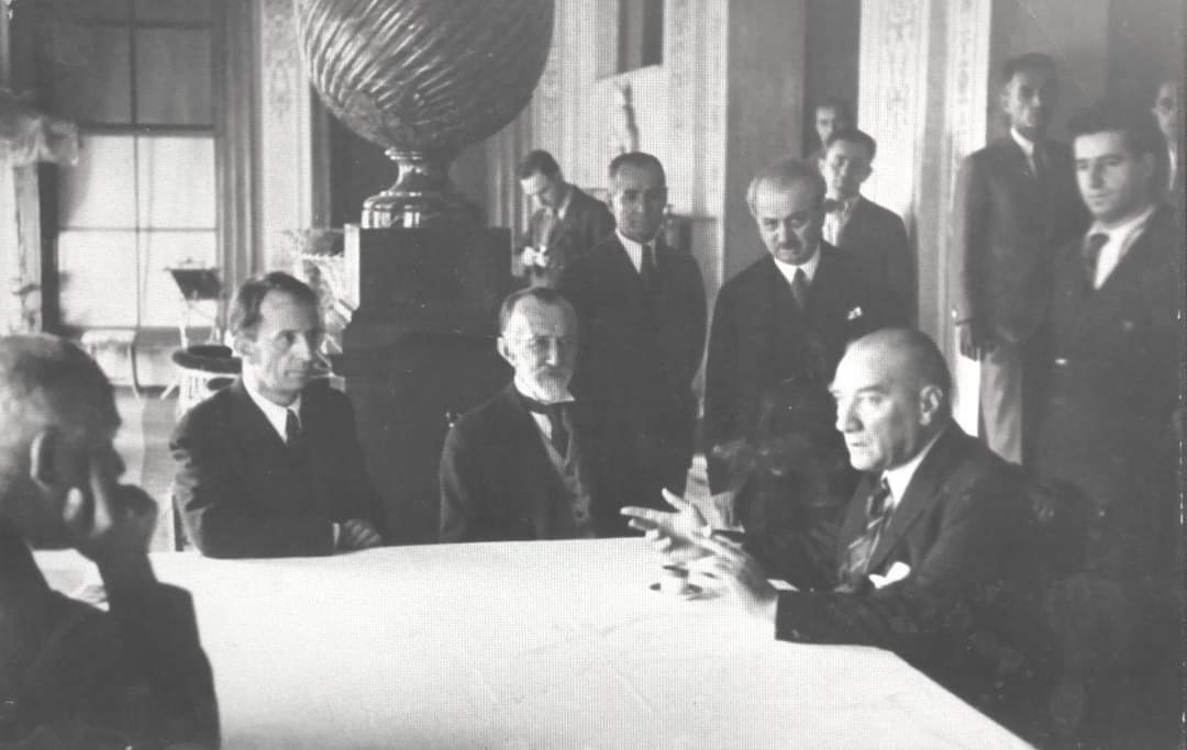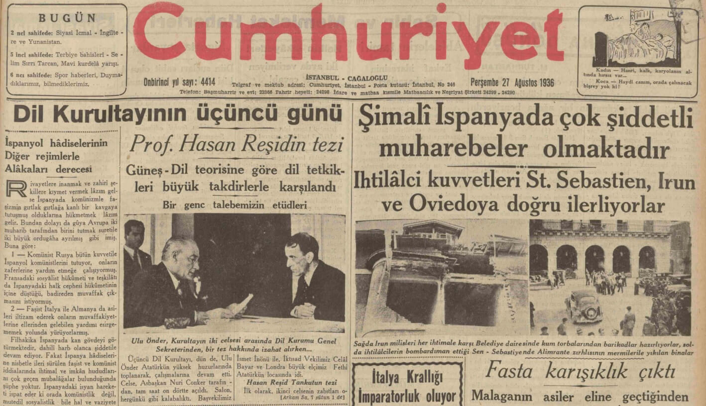 Söz konusu fotoğraf 27 Ağustos 1936 tarihli Cumhuriyet gazetesinde “Ulu Önder, Kurultayın iki celsesi arasında Dil Kurumu Genel Sekreterinden bir tez hakkında izahat alırken” alt yazısıyla aktarılmış.