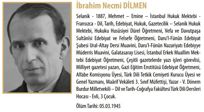 İbrahim Necmi Dilmen (14 Ekim 1887 – 5 Mart 1945), Türk dilinin yapısı, dilbilgisi kuralları ve Türk edebiyatının gelişimi üzerine yaptığı araştırmalarıyla tanınmaktadır. Türk dilinin gramerini, dilbilgisi kurallarını ve dilin tarihsel gelişimini inceleyen, Türk edebiyatının tarihini ve evrimini, farklı dönemlerdeki edebi akımları ve yazarları analiz eden İbrahim Necmi Dilmen, Harf İnkılâbı’nın hayata geçirilmesinde önemli rol oynamıştır. Harf Devrimi hazırlık sürecinde Dolmabahçe Sarayı’nda konferanslar veren Dilmen Türk Dil Kurumu kurucuları arasında yer almıştır. Türk Dili Tetkik Cemiyeti (Türk Dil Kurumu) Genel Sekreteri (Umûmî Kâtibi) görevini üstlenen İbrahim Necmi Dilmen, Güneş-Dil Teorisi üzerine çalışmıştır. Ankara Dil ve Tarih Coğrafya Fakültesi’nde Türk dil bilimi ve Türk edebiyatı alanında dersler veren Dilmen, TBMM V., VI. ve VII. Dönem Burdur Milletvekilliği yapmıştır. Dil üzerine çalışmalarından hareket İbrahim Necmi Bey’e Dilmen soyadı Atatürk tarafından verilmiştir.