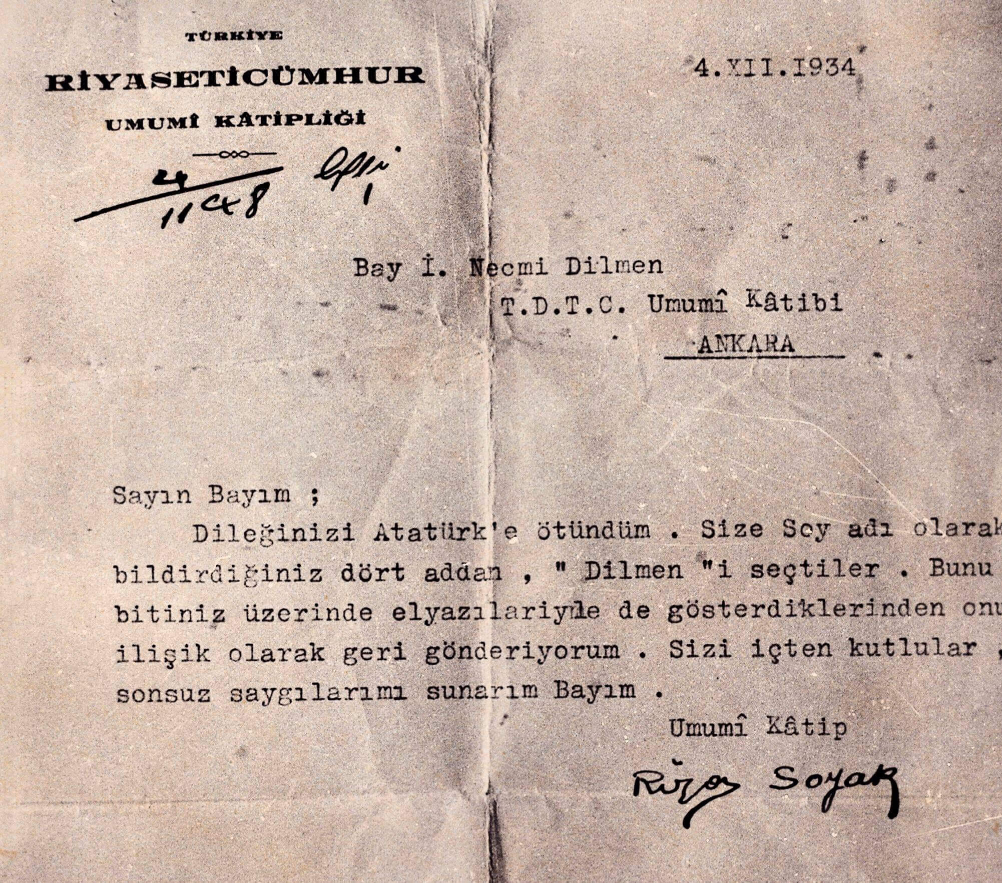 Atatürk, İbrahim Necmi Dilmen’in Dil Bayramını kutlama telyazısına 29 Eylül 1936 tarihinde çektiği telyazısıyla şu yanıtı göndermişti: