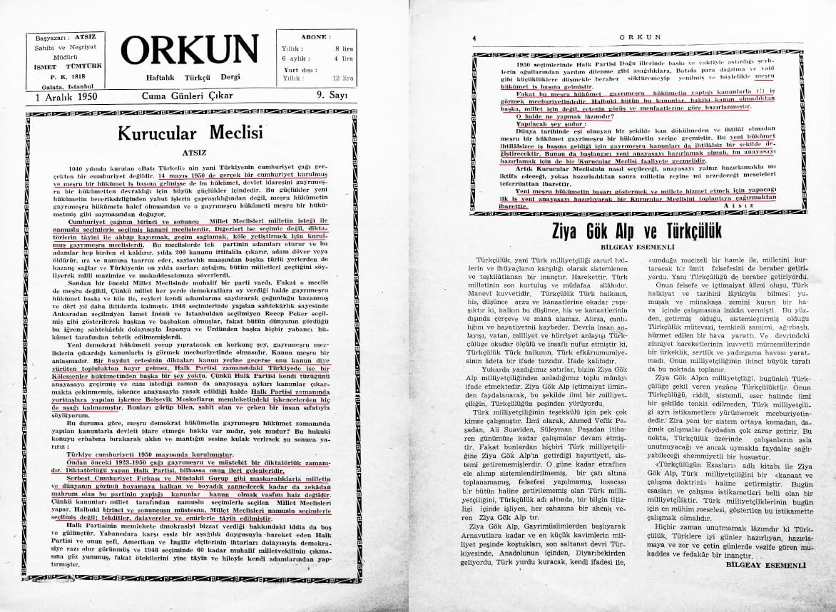 Bahsi geçmişken, Nihâl Atsız’ın Atatürk dönemi Türkiyesi ile ilgili 1 Aralık 1950 tarihinde Orkun dergisinde yayımlanan “Kurucular Meclisi” başlıklı yazısında yer verdiği yorumunu da alıntılayalım: