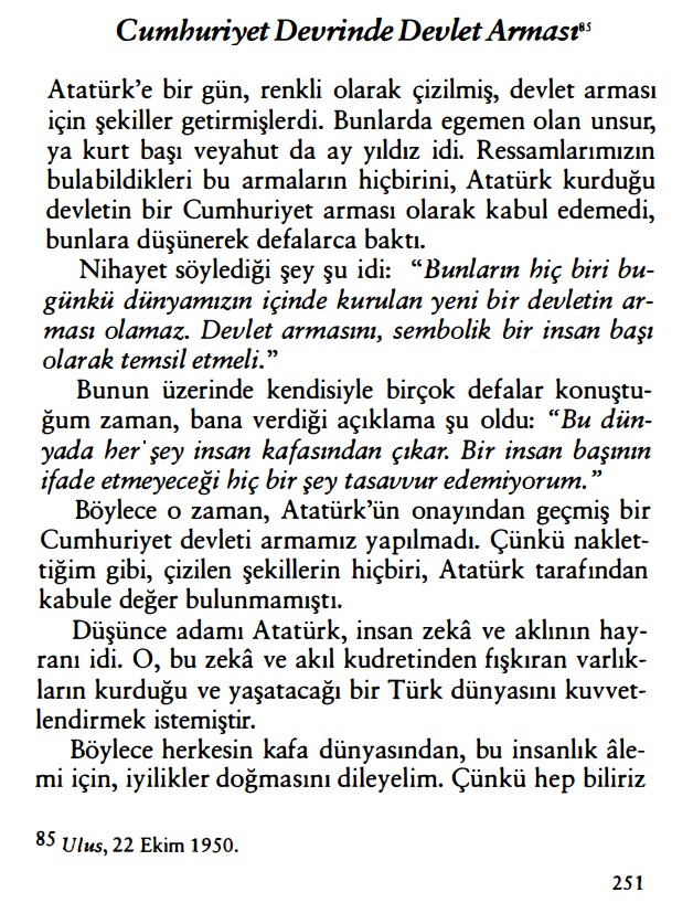 “Atatürk’e bir gün, renkli olarak çizilmiş, devlet arması için şekiller getirmişlerdi. Bunlarda egemen olan unsur, ya kurt başı veyahut da ay yıldız idi. Ressamlarımızın bulabildikleri bu armaların hiçbirini, Atatürk kurduğu devletin bir Cumhuriyet arması olarak kabul edemedi, bunlara düşünerek defalarca baktı.