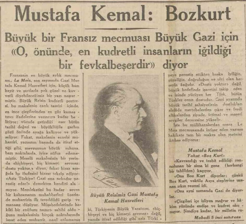 Cumhuriyet gazetesinin 15 Aralık 1933 tarihli manşetinde Fransız Le Mois dergisinin 1933 yılına ait bir sayısında Atatürk için “bozkurt” ifadesini kullandığı “Mustafa Kemal: Bozkurt. O’na bozkurt diyorlar. çünkü bozkurt, vakti ile Asya steplerine uzanan ırkın sembolüdür.” alıntısıyla aktarılmıştı.