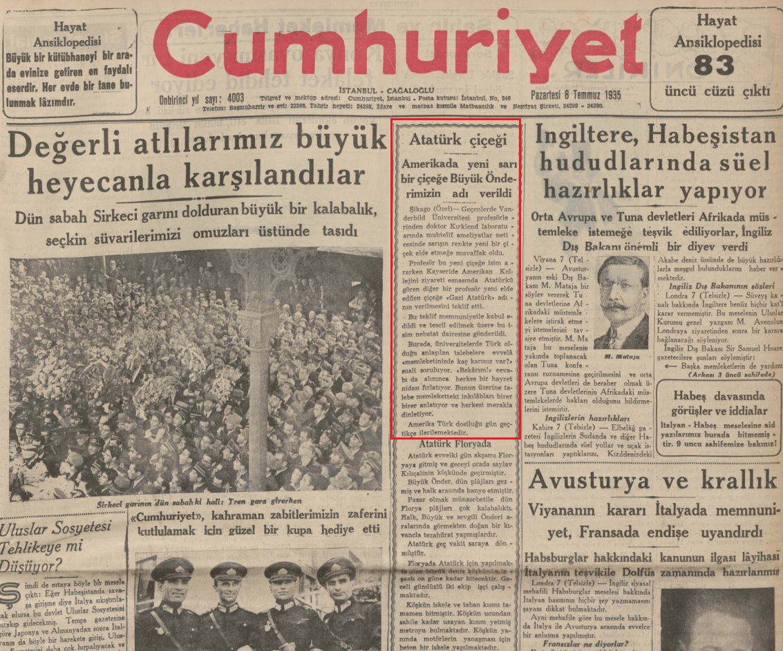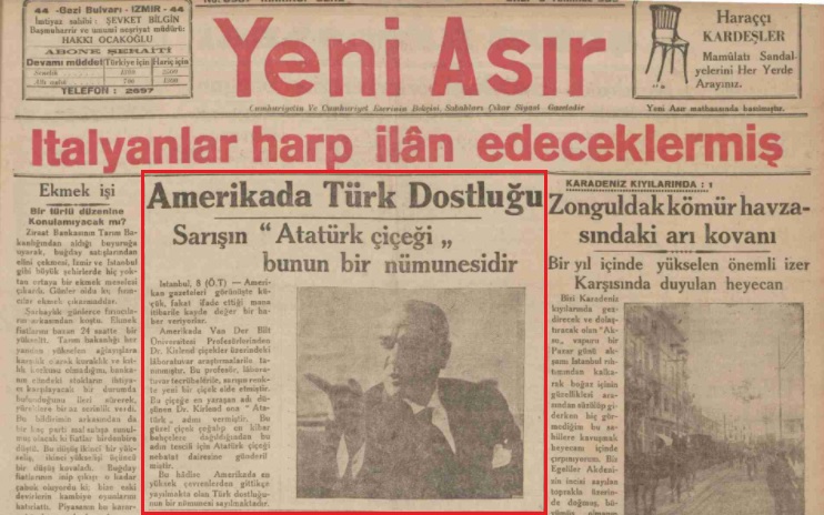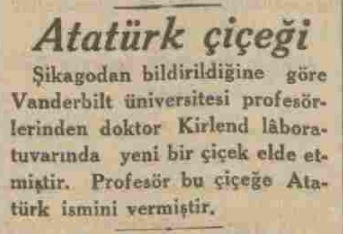 Şikagodan bildirildiğine göre Vanderbilt üniversitesi profesörlerinden doktor Kirlend laboratuvarında yeni bir çiçek elde etmiştir. Profesör bu çiçeğe Atatürk ismini vermiştir.”