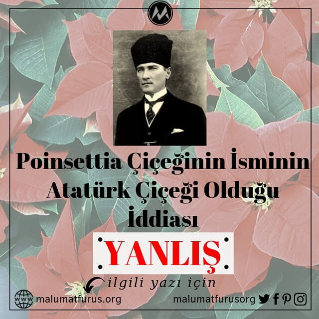 Poinsettia bitkisinin ismini Atatürk’ten aldığı ve tüm dünyada bu şekilde bilindiği iddiası gerçeği yansıtmıyor. Bahse konu çiçek sadece ülkemizde Atatürk Çiçeği ismi ile biliniyor ve iddia edildiği gibi geliştirilip tüm dünyada kabul edilecek şekilde “Atatürk Çiçeği” olarak adlandırılmamıştır.