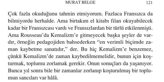 Çok fazla okuduğunu tahmin etmiyorum. Fazlaca Fransızca da bilmiyordu herhalde. Ama birtakım el kitabı filan okuyabilecek kadar bir Fransızcası vardı ve Fransızlardan bir türlü etkilenmişti. Ama Rousseau’da Kemalizm’e gitmeyecek başka şeyler de vardır, örneğin pedagojiden bahsederken “en verimli biçimde zaman kaybetme sanatıdır,” der. Bu hiç Kemalizm’e benzemez, çünkü Kemalizm’de zaman kaybedilmemelidir, bunun için koşturmak, toplumu zorlamak gerekir. Onun sonuçları da yaşanıyor. Bunca yıl sonra bile bir zamanlar zorlanıp koşturulmuş bir toplumun sancıları var hâlâ.