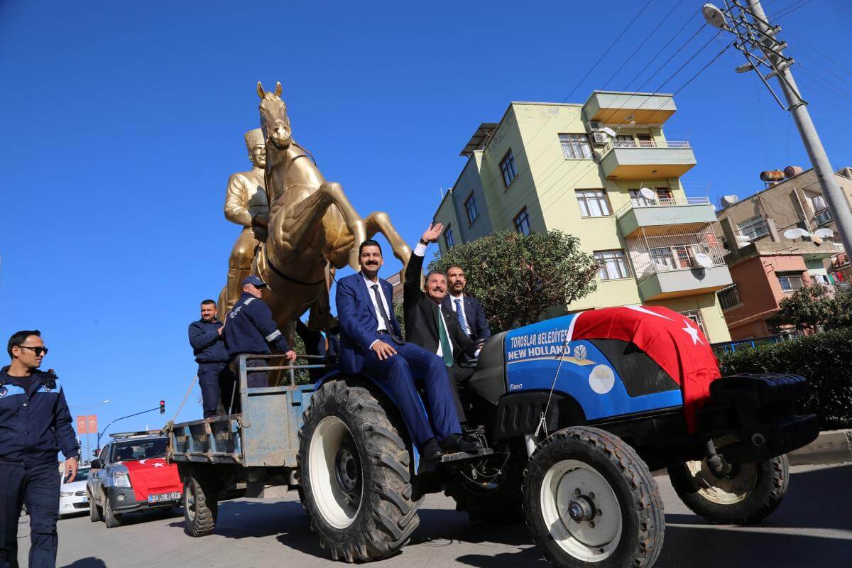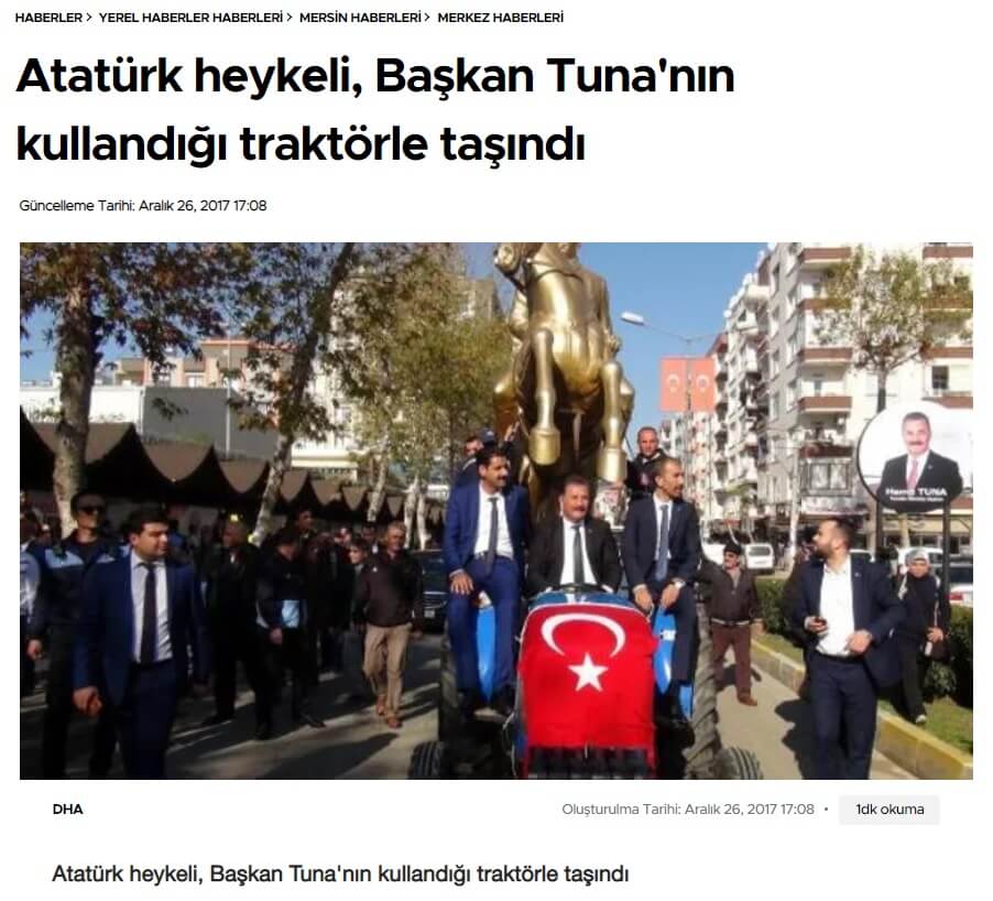 Mersin’de yaptırılan Atatürk heykelinin kentte yerleştirileceği alana 2017 yılı Aralık ayında konvoy eşliğinde Toroslar Belediye Başkanı Hamit Tuna’nın kullandığı traktörün üzerinde getirildiği anı yansıtıyor.