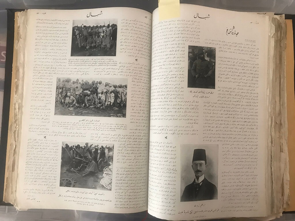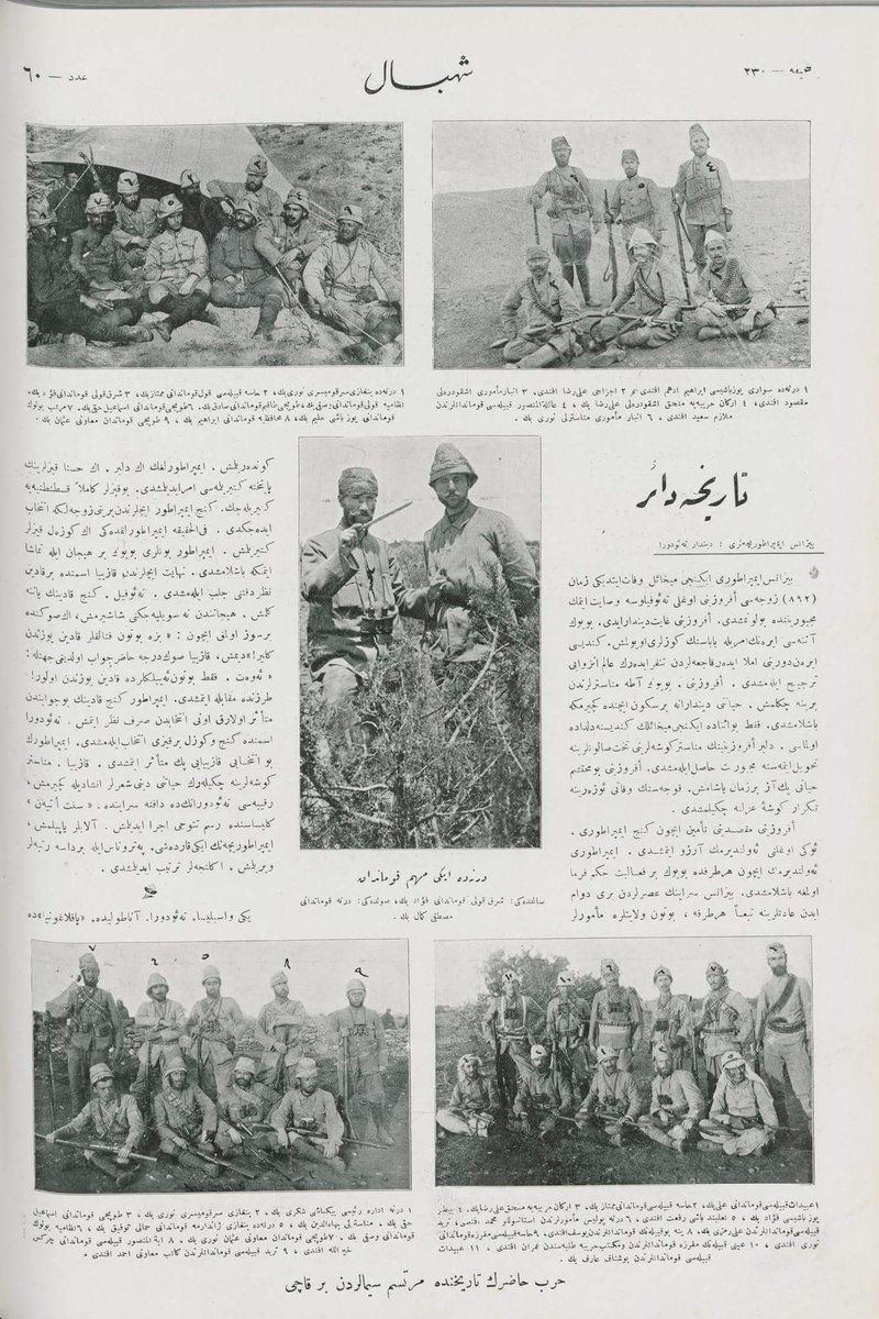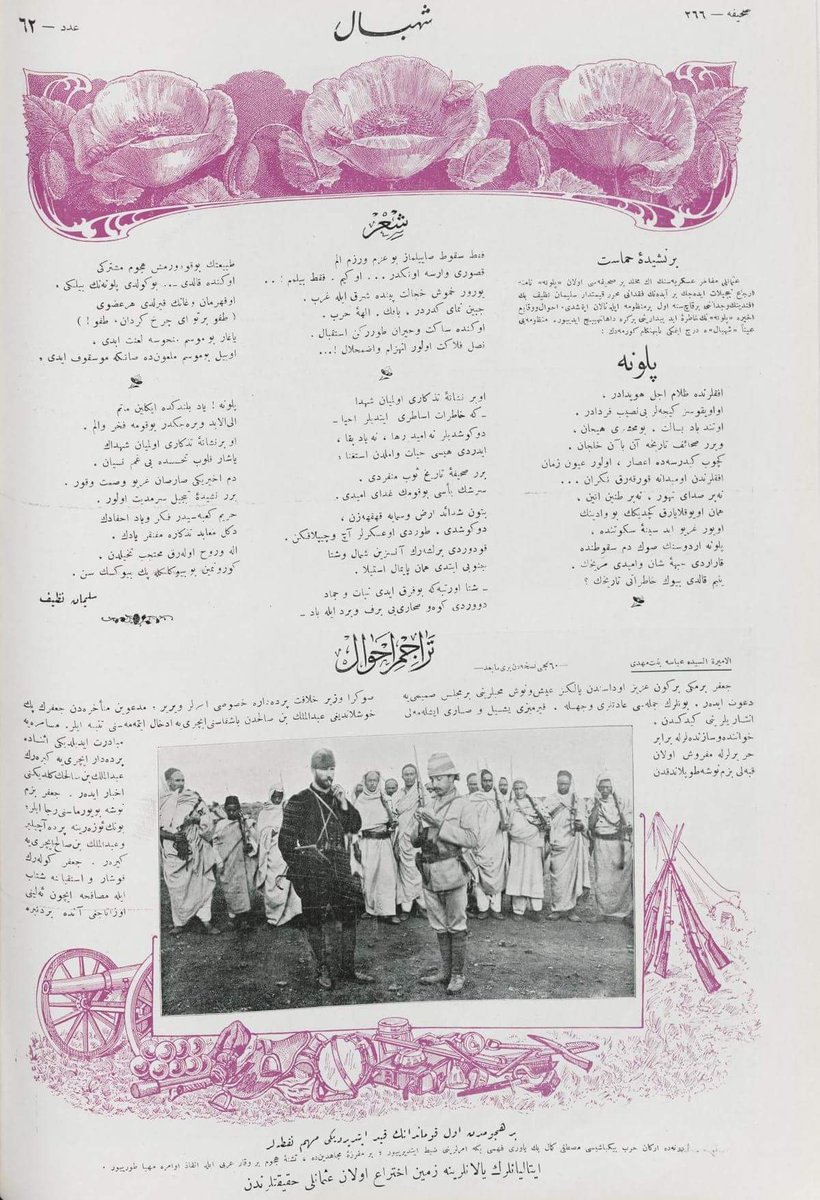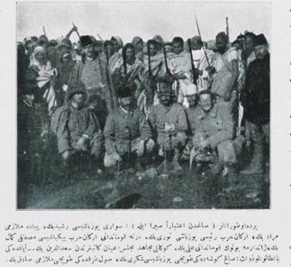 “Cihan-ı cihadda cevval-i cephelerden: Ortadaki nasiye-i necip, meşagil-i harp sebebiyle haledar-ı lihye olan Kahraman Enver Beyedir. Sağında bastonlu zat Derne Kumandanı Erkân-ı Harbiye binbaşısı Mustafa Kemal Bey” notuyla Mustafa Kemal’in fotoğrafının yer aldığı sayfa:
