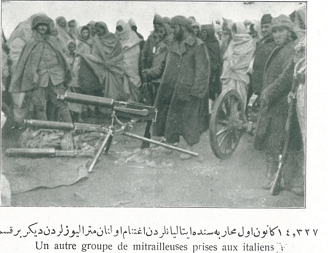 Eylül 1324/1908 yılında yayımlanan ilk sayısıyla yayım hayatına başlayıp Ekim 1329/1914 yılında yayımladığı son sayısıyla yayım hayatını sonlandıran Resimli Kitap adlı derginin 1912 yılı Mayıs ayındaki 40. sayısında aşağıdaki fotoğraf “327, 14 Kânûn-ı Evvel muhârebesinde İtalyanlar’dan igtinâm olunan mitralyözlerden diğer bir kısmı (Un autre groupe de mitrailleuses prises aux italiens)” notuyla yayımlanmış (Tespit: Mesut Uyar) (Emre Zebek (2019). “Resimli Kitap Dergisinin 35-41. Sayılarının İncelenmesi”. Yüksek Lisans Tezi. Bursa Uludağ Üniversitesi Sosyal Bilimler Enstitüsü).
