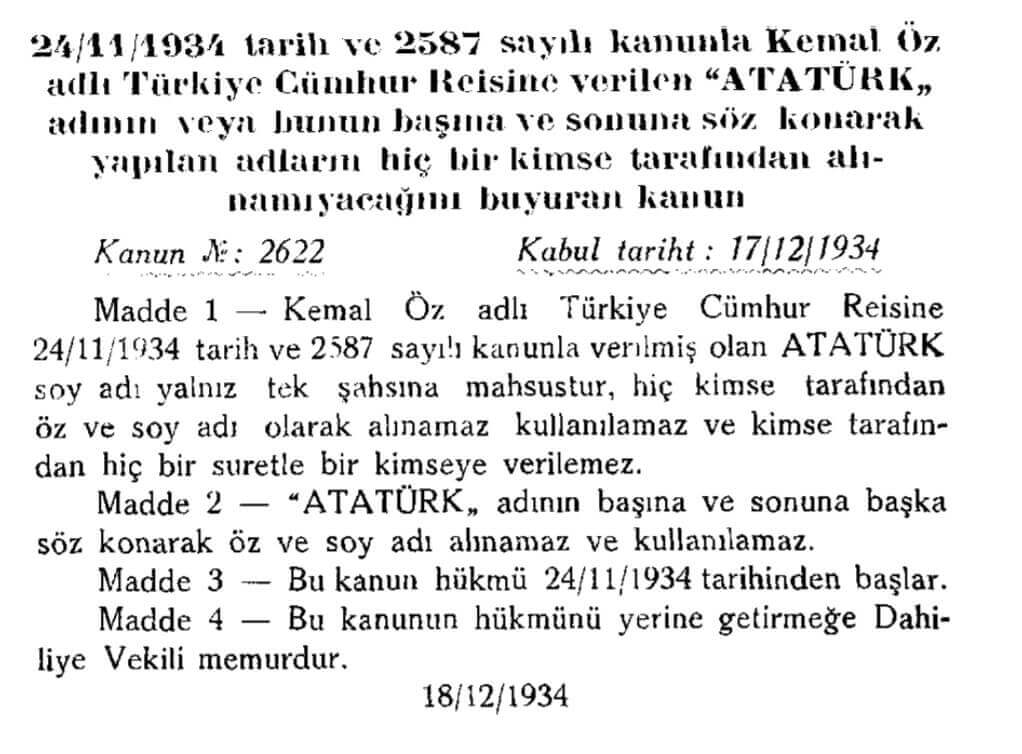 Soyadı Kanunu’nun kabulünün 5 ay akabinde TBMM tarafından oybirliği ile kabul edilen 24 Kasım 1934 tarihli ve 2587 sayılı kanun ile Cumhurbaşkanı Mustafa Kemal’e “Atatürk” soyadı verilmişti. “Kemal öz atlı Cumhur Reisimize verilen soy adı hakkında kanun“un maddeleri şu şekilde idi: