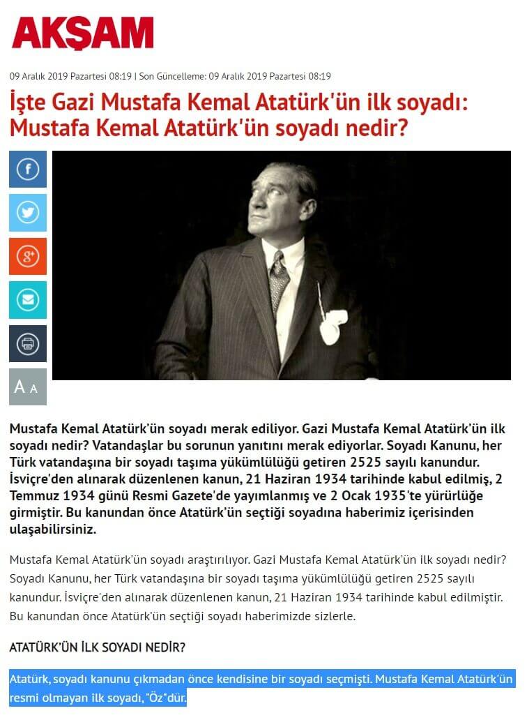 1934 yılında çıkartılan 2525 sayılı Kanun ile Atatürk soyadını alan Mustafa Kemal’in ilk soyadının ‘Öz’ olduğu yönünde yanlış bir iddia dile getirilmektedir.