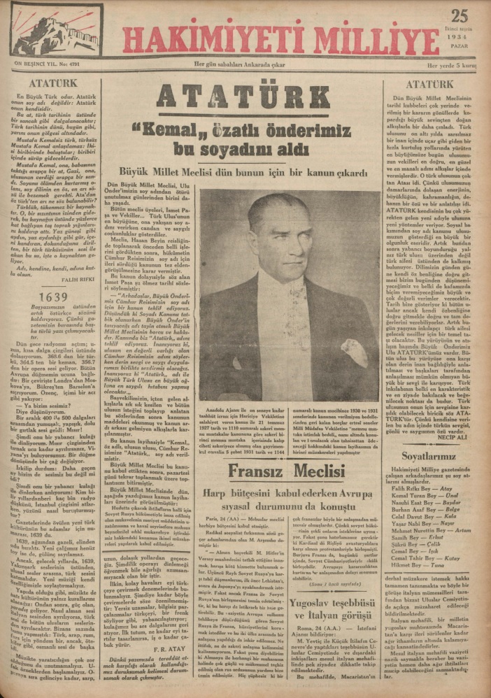 Hakimiyeti Milliyet’in 25 Kasım 1934 tarihli “Atatürk – ‘Kemal’ özatlı önderimiz bu soyadı aldı” manşetli sayısı
