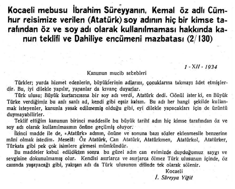 2622 sayılı Kanun teklifi Kocaeli Milletvekili İbrahim Süreyya tarafından sunulmuştu. “Kocaeli mebusu İbrahim Süreyyanın, Kemal öz adlı Cumhur Reisimize verilen « Atatürk» soy adının hiç bir kimse tarafından öz ve soy adı olarak kullanılmaması hakkındaki kanun teklifi” metni açıklaması şu şekilde idi:
