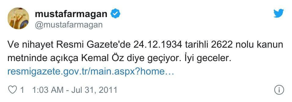 "Ve nihayet Resmi Gazete'de 24.12.1934 tarihli 2622 nolu kanun metninde açıkça Kemal Öz diye geçiyor. İyi geceler.