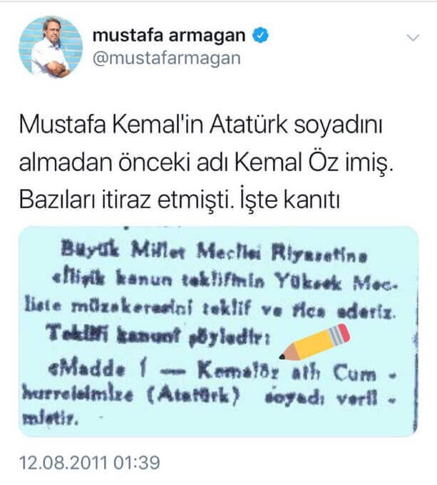 Kapatılan Zaman Gazetesinde ve Yeni Şafak Gazetesinde köşe yazıları yazan Mustafa Armağan, Atatürk’ten önceki soyadının “Öz” olduğunu “Mustafa Kemal’in Atatürk soyadını almadan önceki adı Kemal Öz imiş. Bazıları itiraz etmişti. İşte kanıtı” sözleriyle öne sürmüştü. Her ne kadar bahsi geçen tweet silinse de Mustafa Armağan bu iddiasına sosyal medya hesaplarından yaptığı diğer paylaşımlarda hâlâ erişilebiliyor: