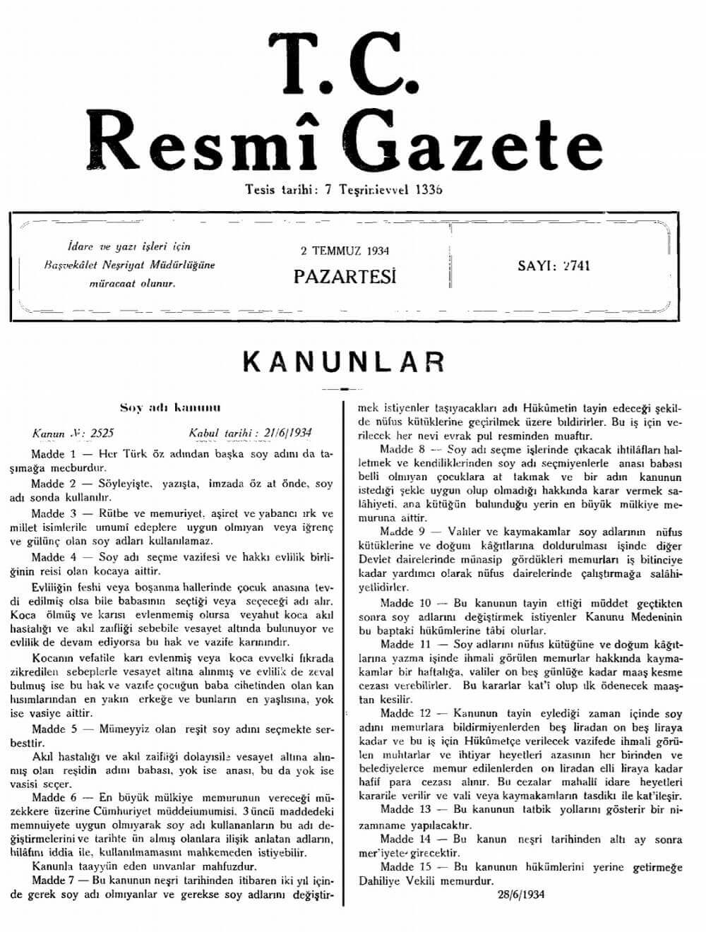 21 Haziran 1934 tarihli 2525 sayılı Soy Adı Kanunu’nun yayımlandığı Resmi Gazete nüshasının ilk sayfası